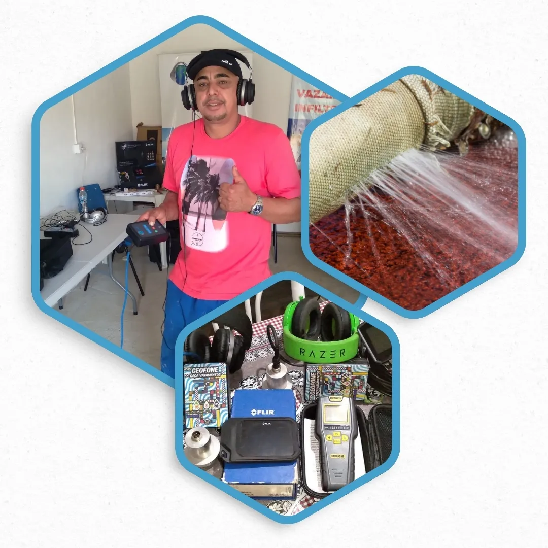 Detecção precisa de vazamentos ocultos utilizando câmera termográfica, geofone eletrônico, medidor de umidade, pressurização e traçador químico, sem a necessidade de quebrar paredes ou pisos.